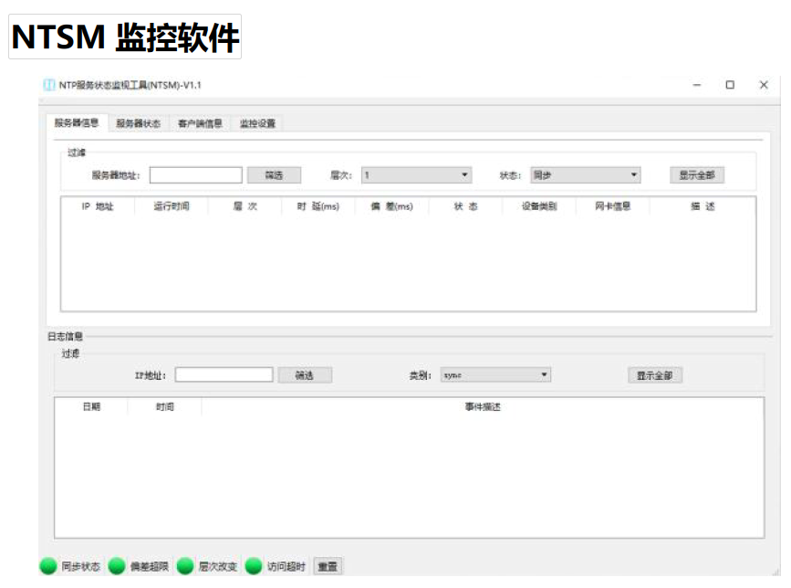 ◆用于對設備中NTP服務的詳細監(jiān)控; ◆可監(jiān)視服務器自身的狀態(tài)信息,包括同步狀態(tài)、時間偏差、層次信息等; ◆可監(jiān)視衛(wèi)星參考源信息,包括鎖定狀態(tài)、定位信息等; ◆可監(jiān)視NTP客戶端訪問情況和時間偏差; ◆支持時間偏差門限告警、失鎖告警和狀態(tài)切換告警; ◆支持SNMP、SYSLOG、EMAIL等告警方式。